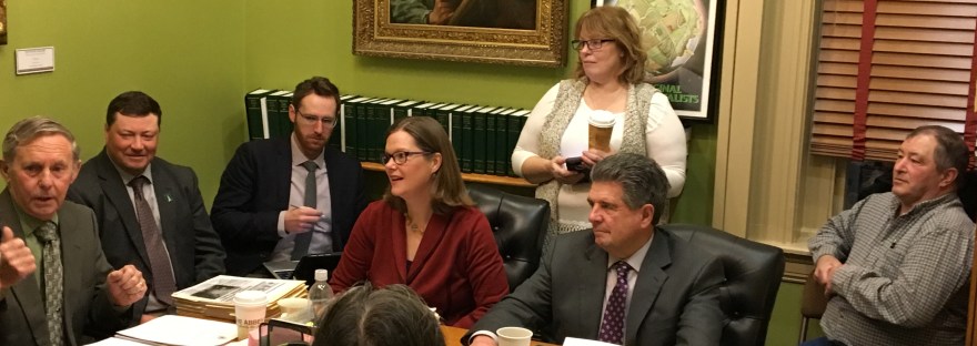 Most of the work of the legislature is done in committee, where small groups of legislators research issues, take testimony from a broad array of interested parties, discuss and amend bills line by line, and craft legislation that committee members can support. I was assigned to serve on the Agriculture and Education Committees. I spend my mornings learning as much as I can about farming, forestry, rural economics, and agricultural and environmental sciences. I spend my afternoons more confidently using my knowledge of education policy and finance. (See the photo above of the Senate Agriculture Committee discussing a bill in our cramped committee room, with many people listening in on our discussion.)
