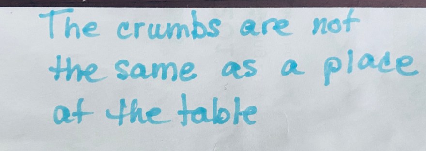 Last weekend, a constituent handed me a slip of paper she keeps posted above her desk, which reads, “The crumbs are not the same as a place at the table.” She thanked me for making sure that her social service & healthcare organization, and the people it serves, got more than crumbs this year, and always has a place at the table in Montpelier.
