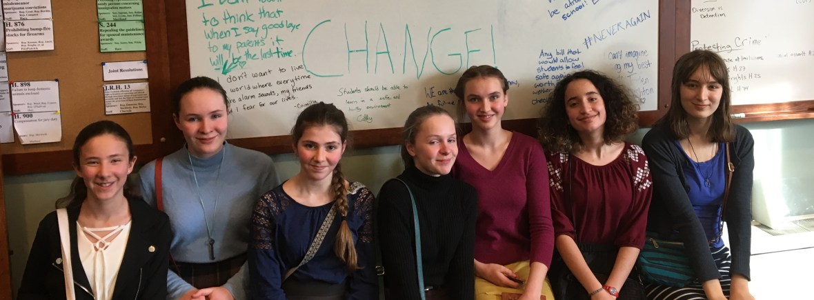 Photo Note: Middlebury High School students at the State House for a hearing on gun safety legislation in 2018, posing in front of a message board in the House Judiciary Committee room created by Middlebury Middle School students who had testified earlier in the session.
