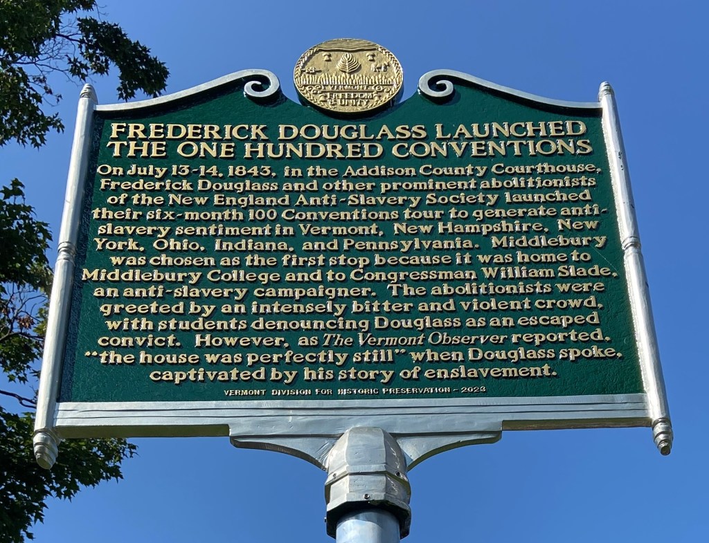 Last month Middlebury College hosted the 2023 Clifford Symposium, led by history Professor Emeritus Bill Hart, honoring the 200th anniversary of the graduation of Alexander Twilight, the first Black man to receive a college degree, from Middlebury College. Twilight was also the first African-American state representative and his portrait now hangs in the VT State House, painted by local artist Katie Runde. Be sure to read the excellent Seven Days cover story about Twilight, the symposium and portrait. During the Symposium, a new historic marker was unveiled on Court Square, commemorating the 180th anniversary of the great abolitionist Frederick Douglass’ lecture in Middlebury, where he was met with hostility and racism. In my remarks at the unveiling, I said that I hoped the marker would remind the residents and visitors of our town that we must do better to make our town and college ones that would live up to the good-hearted, open-minded, anti-racist people that Douglass had hoped to find here.